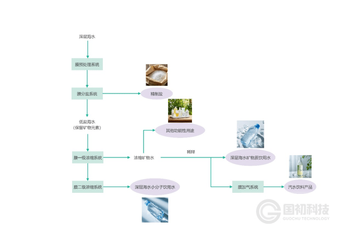 为了更好满足深层海水的多元化利用。国初科技(厦门)有限公司利用新型膜分离技术,助力深层海水资源化利用及产品开发。其工艺流程如下: