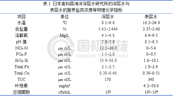 通常而言,深层海水是指位于水深约200米以下,阳光无法穿透、无法进行光合作用的水层。在200m以上的海水层中,由于可以照射到阳光,各种微生物生长活跃,受人类活动影响较大;然而,在水深200米以下的深层海域,海水却异常清澈,微生物含量极少。日本高知县海洋深层水研究所对日本高知县海洋深层水与表层水的水质指标进行对比,如下表1所示: